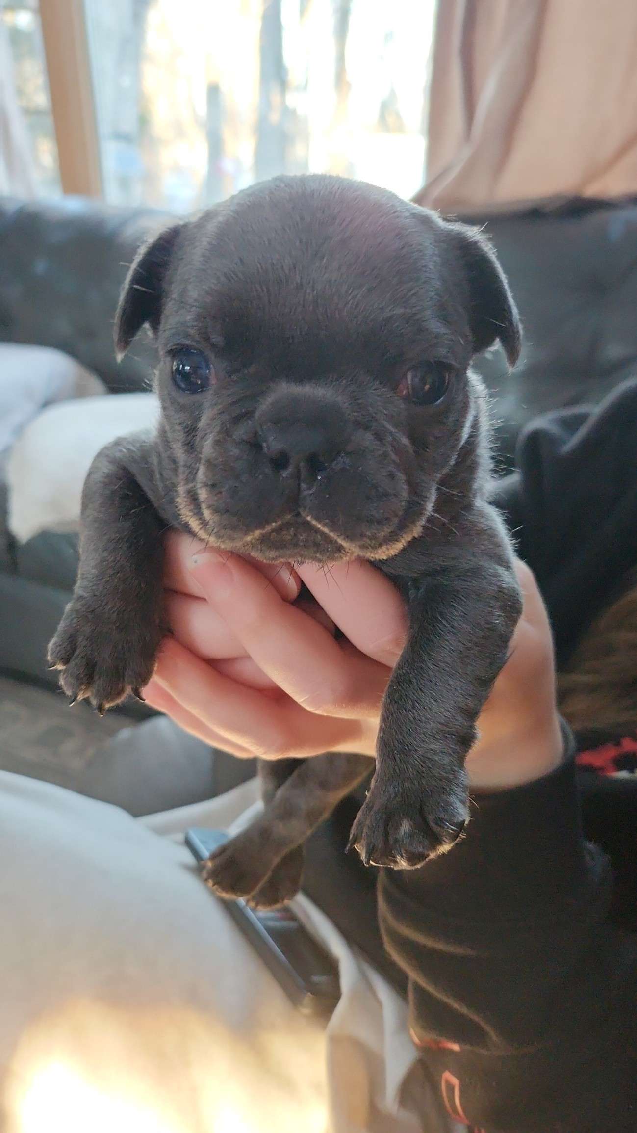 This is Beryl. Litter of 3. He's a very sweet, smart little boy. He was born, Dec. 1, 25 and will be available, Feb. 9, 26. I keep them for 10 weeks. This helps with their development and makes for a more rounded, secure pup. They are raised with other animals, and exposed to many different sounds. They are handled daily and groomed regularly, so they are used to being handled for nails and vet visits. I do not immunize, I feel they are too young to add toxins before they have a chance to develop. They are AKC and bred for health, wide nares and a fuller muzzle. Please reach out for more information.